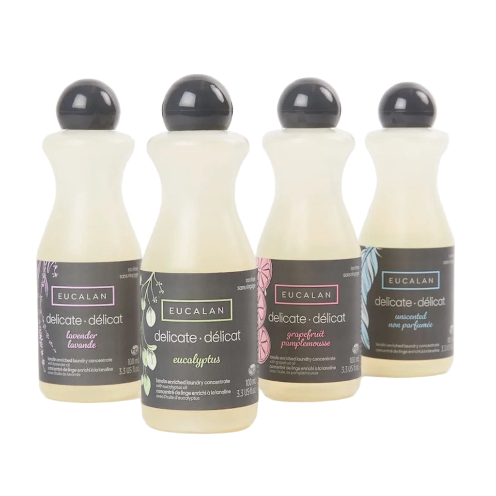 Eucalan No Rinse Delicate Wash is non-toxic, biodegradable, free of optical brighteners, phosphates, synthetic fragrance and dye. Eucalan is pH neutral and is packaged in an easy to recycle, dye free HDPE plastic bottle. Available in 5 scents, Eucalan is scented with only quality essential oils, in addition to natural/unscented. The lanolin acts as a natural conditioner, keeping fibres supple and reducing static. Eucalan meets strict European regulations, it is "quickly" biodegradable.