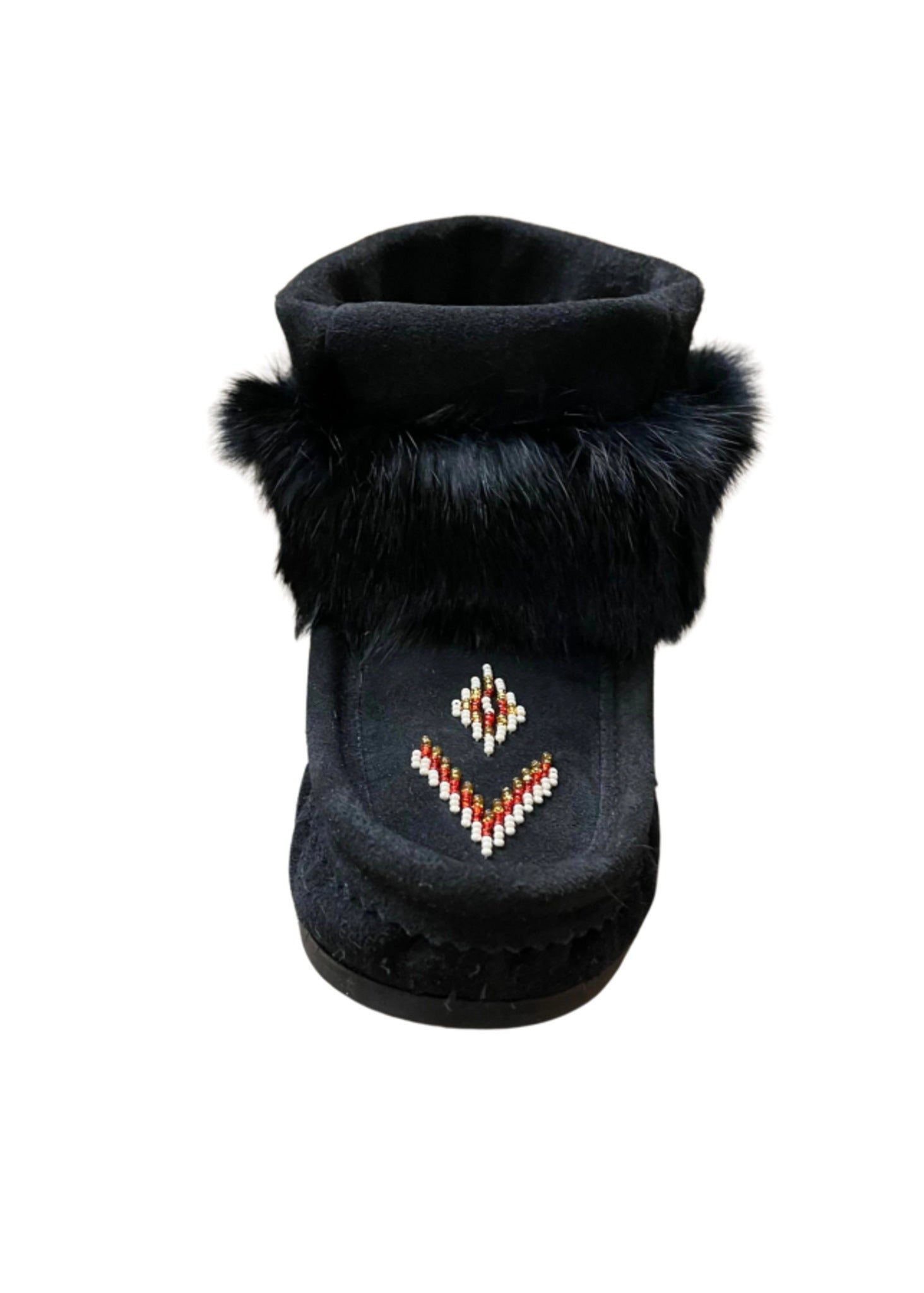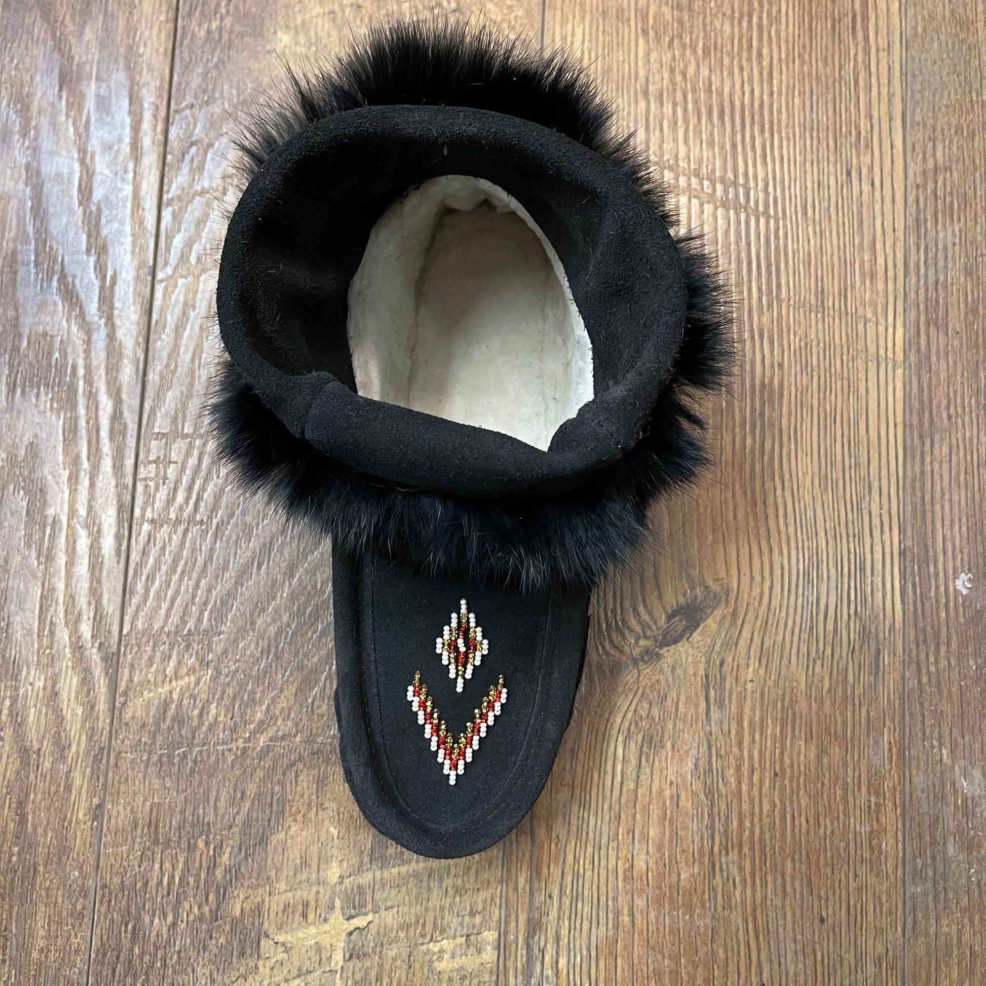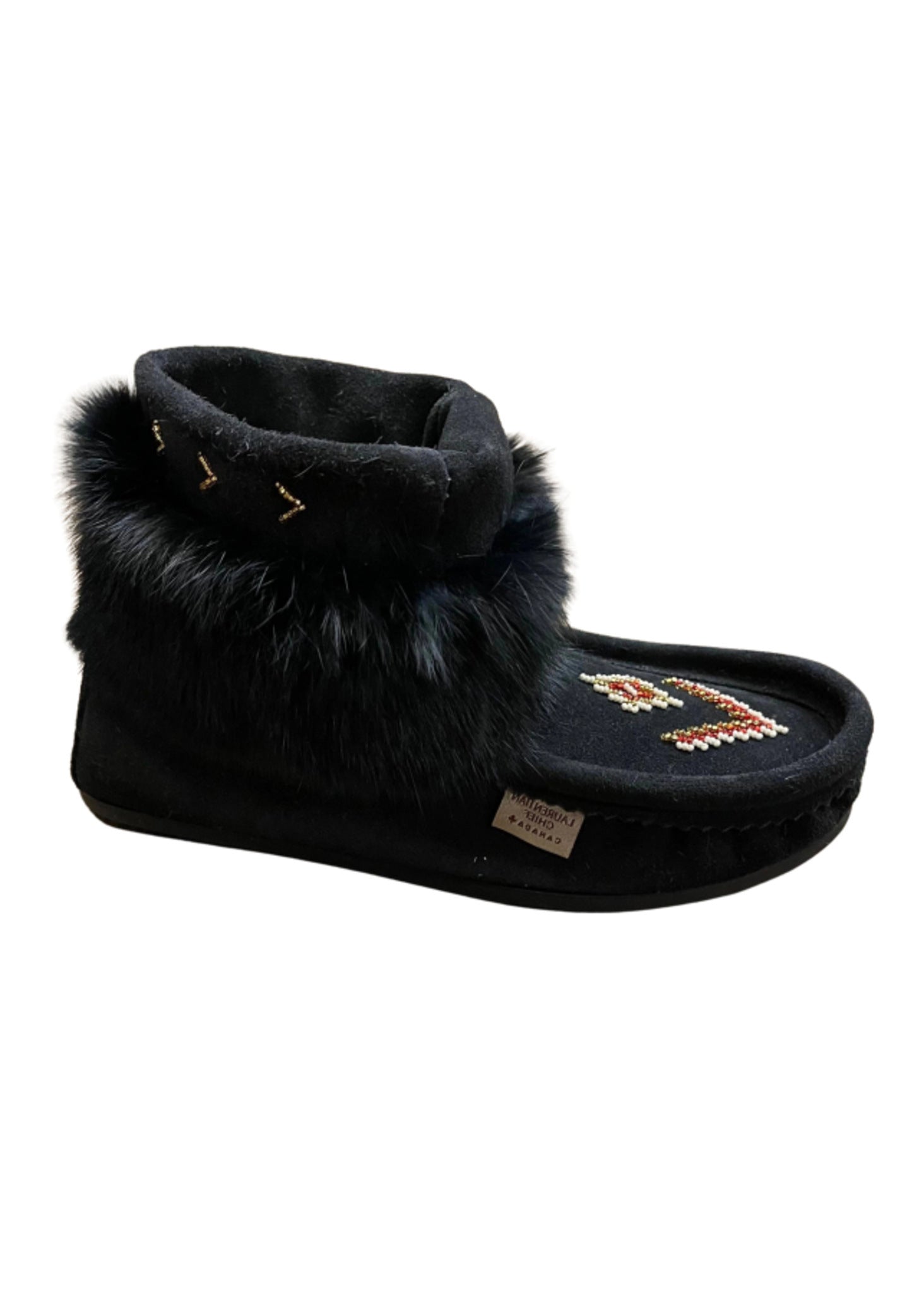 These Native American Nuka-style moccasin boots for women are stylish and comfortable, featuring authentic aboriginal accents like hand-beaded vamps and beaded top trim. The boots are lined with SHEEPSKIN and have a fuzzy rabbit fur trim around the shaft, as well as a durable crepe gum sole.
