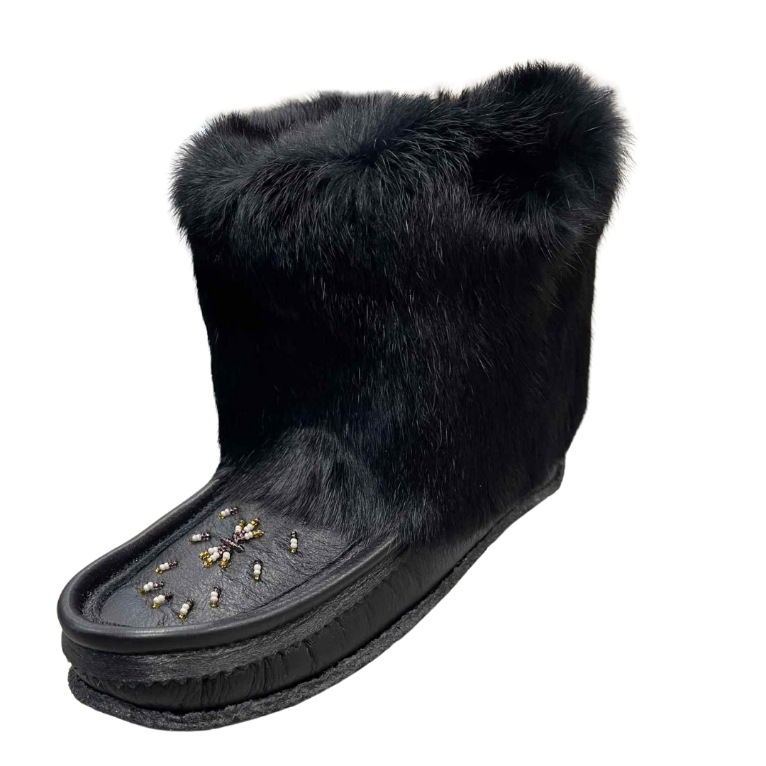 These women's short mukluks winter boots are the best combination of fashion and comfort. They have a warm and cozy sheepskin lining keeping your feet toasty while you are outdoors. The exterior of the boot has fuzzy rabbit fur. These women's traditional style mukluks are handmade from genuine Nappa leather. They have a matching hand-beaded design on the vamp giving them a unique look. They have a durable outdoor crepe/rubber sole. These women's traditional style mukluks are the best 'everyday' winter boots that you can quickly slide on and off since they reach slightly above your ankle and are approximately 7" tall.