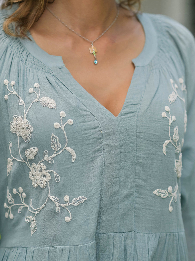 Crafted in 100% cotton, this dress features exquisite hand-guided floral embroidery, artful ruching, and gentle gathers at the tiers for a flowing, feminine silhouette. Thoughtful details like side seam pockets and a button-tie back waist combine beauty with everyday practicality, making it as functional as it is charming.