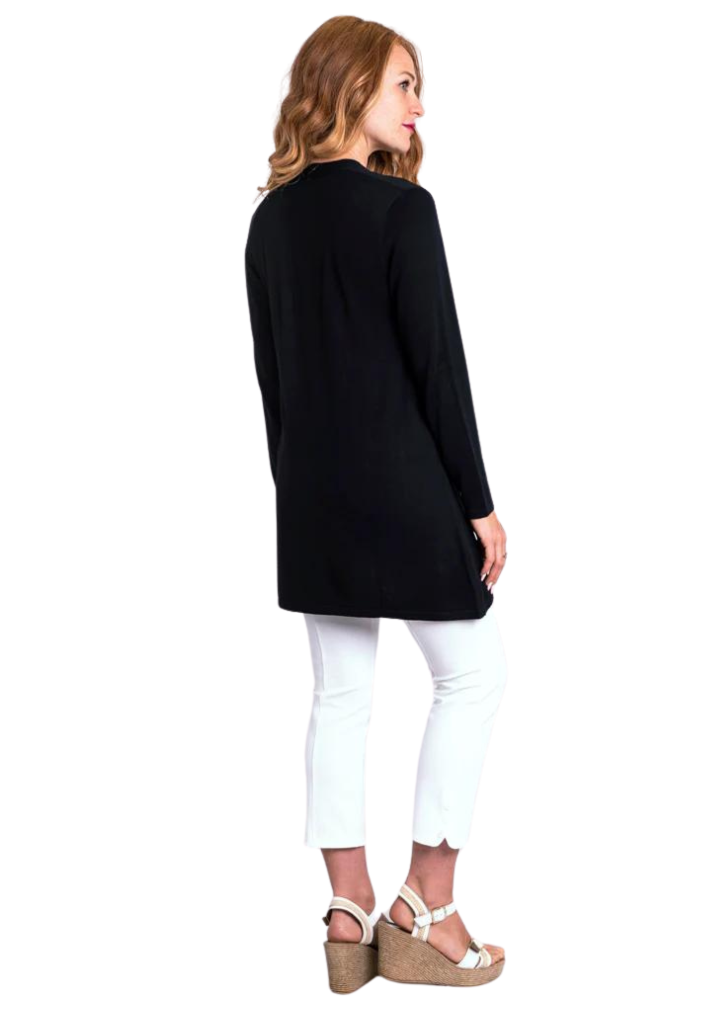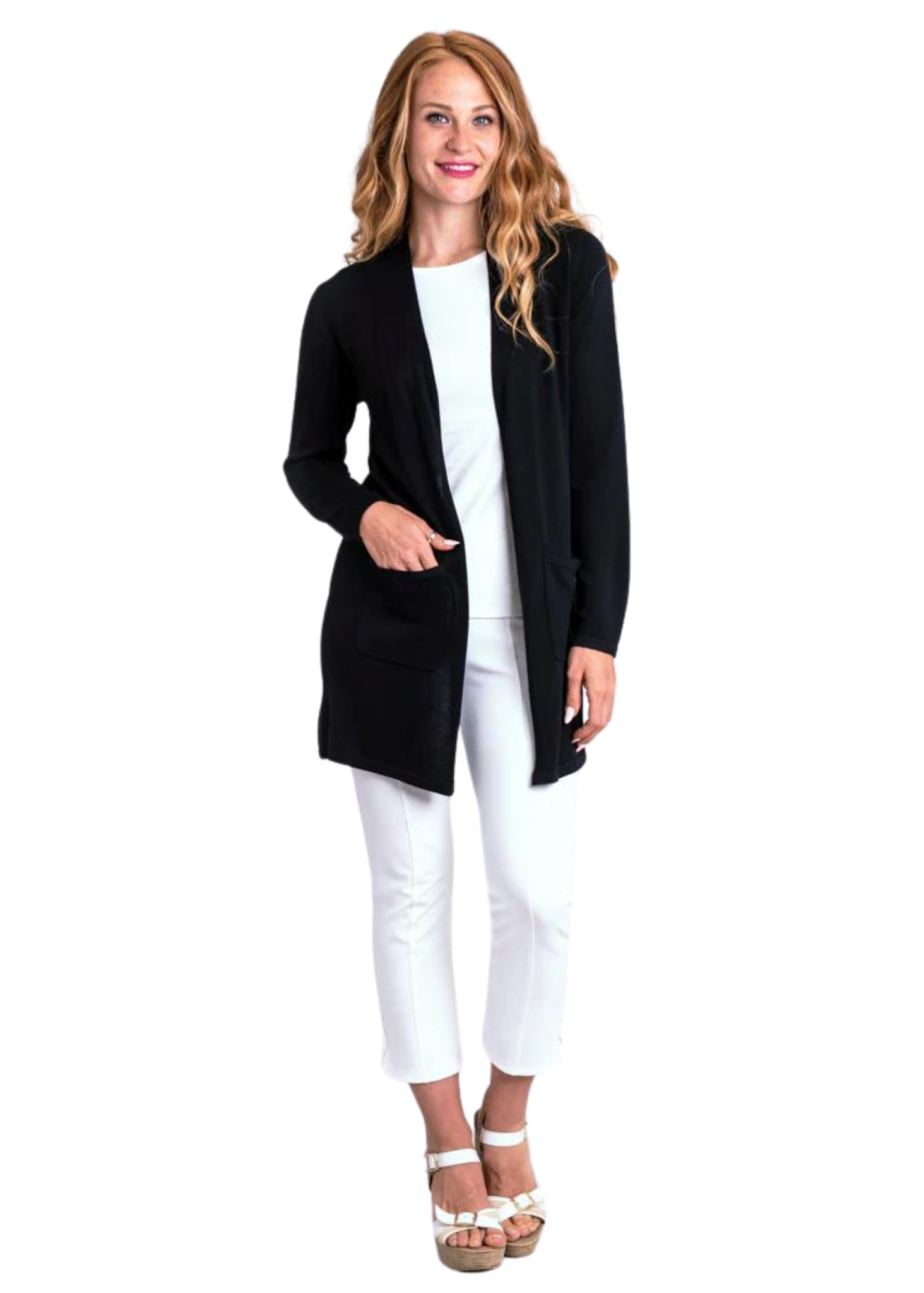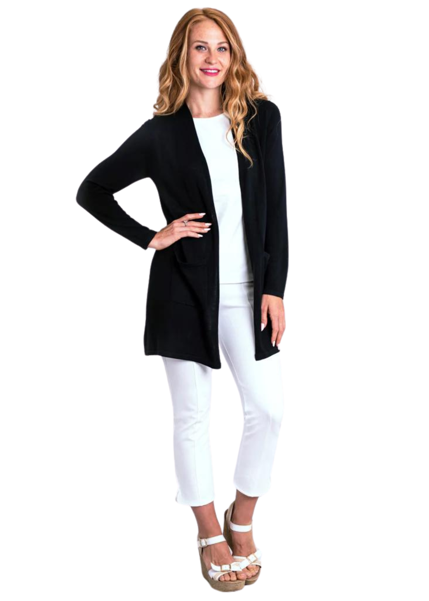 Introducing our cherished Justine Sweater, a quintessential addition to your wardrobe! This open-style cardigan boasts functional pockets and elongating, slim lines. The Justine is thoughtfully crafted to offer ample coverage, gracefully falling below the hips. Perfect for layering over dresses, blouses, and sleeveless tops for effortless style.