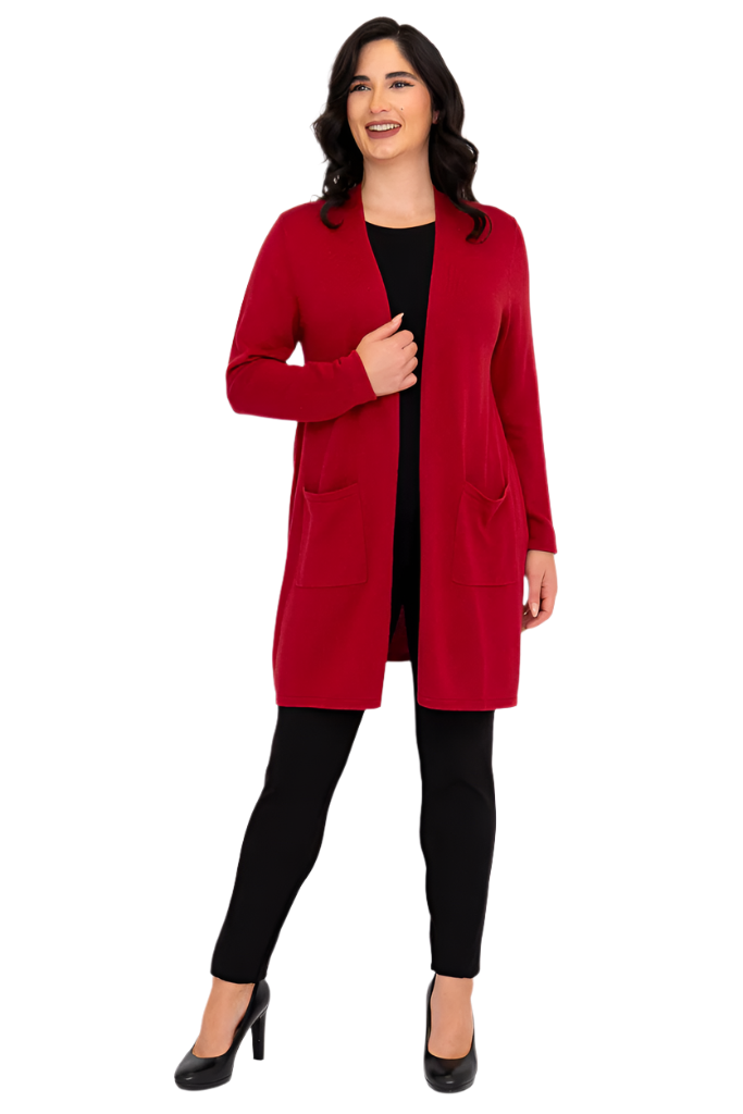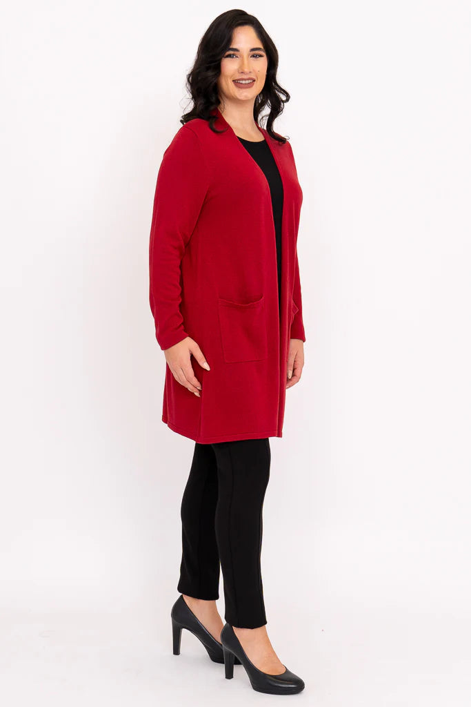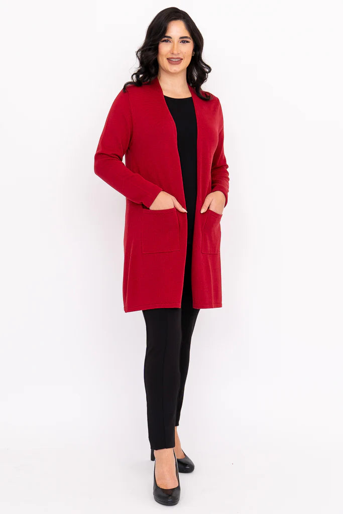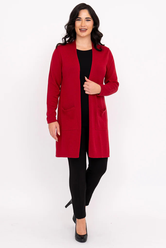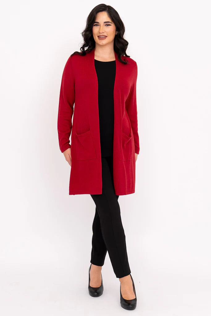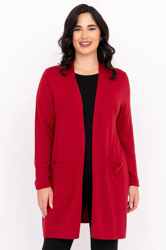 Introducing our cherished Justine Sweater, a quintessential addition to your wardrobe! This open-style cardigan boasts functional pockets and elongating, slim lines. The Justine is thoughtfully crafted to offer ample coverage, gracefully falling below the hips. Perfect for layering over dresses, blouses, and sleeveless tops for effortless style.