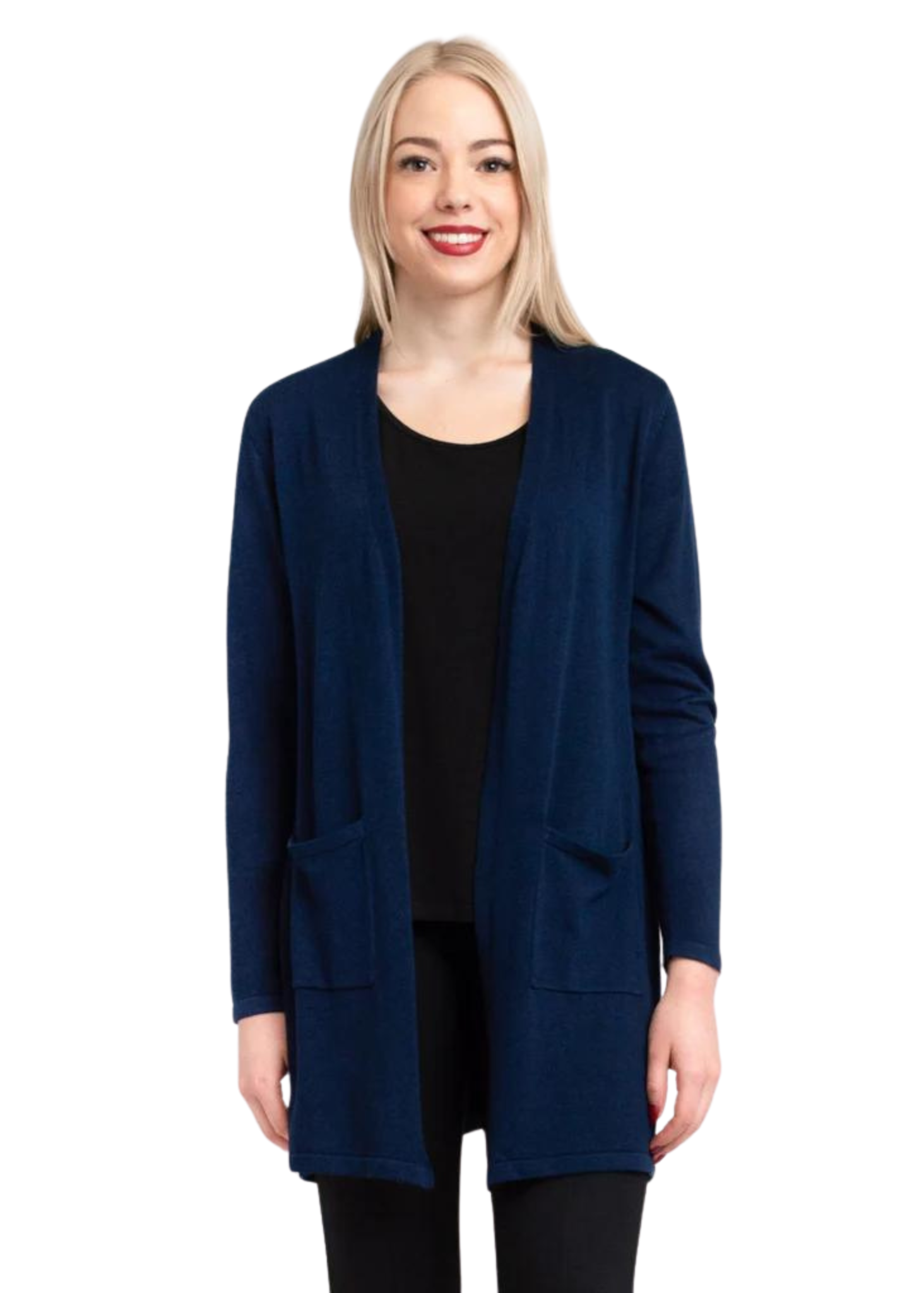 Introducing our cherished Justine Sweater, a quintessential addition to your wardrobe! This open-style cardigan boasts functional pockets and elongating, slim lines. The Justine is thoughtfully crafted to offer ample coverage, gracefully falling below the hips. Perfect for layering over dresses, blouses, and sleeveless tops for effortless style.
