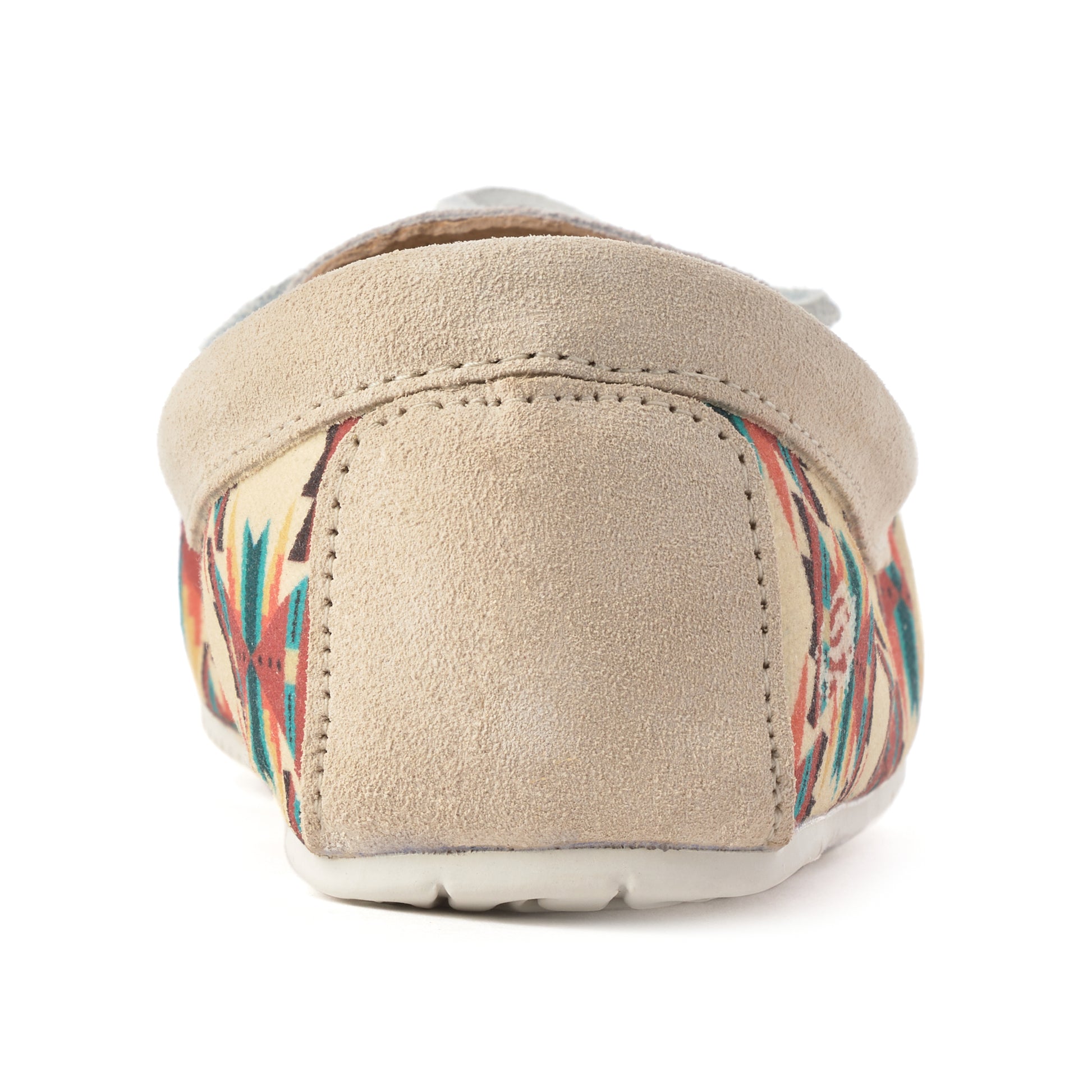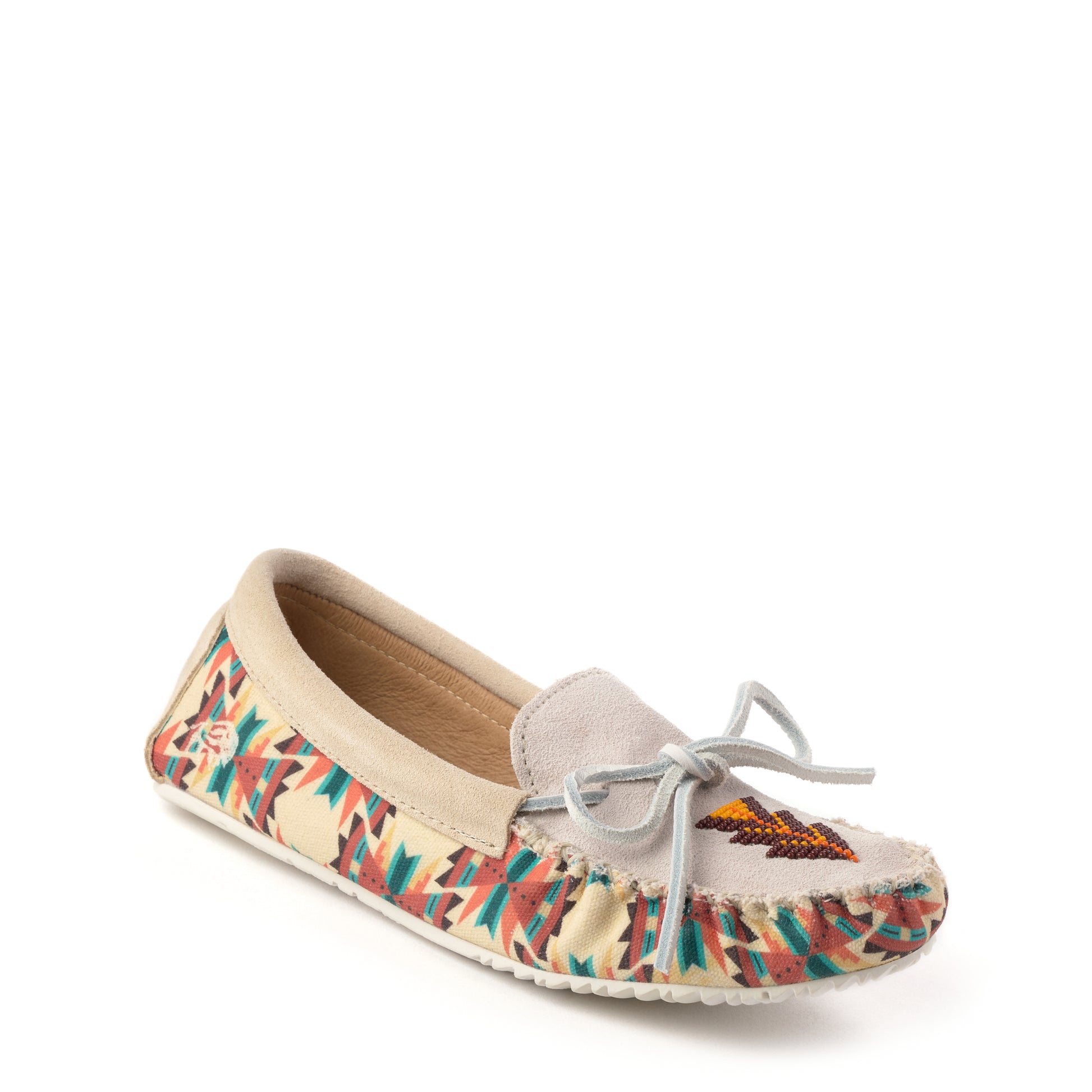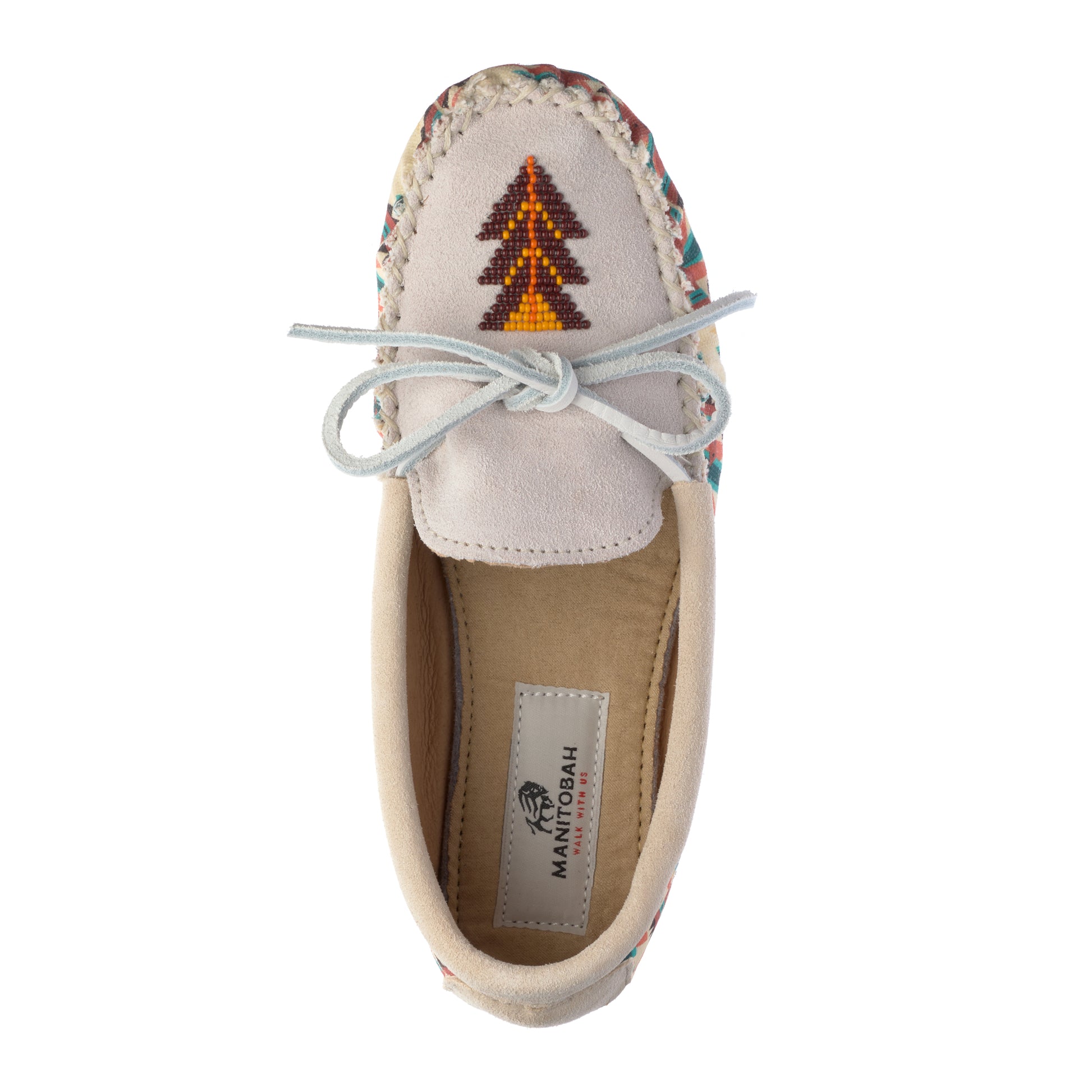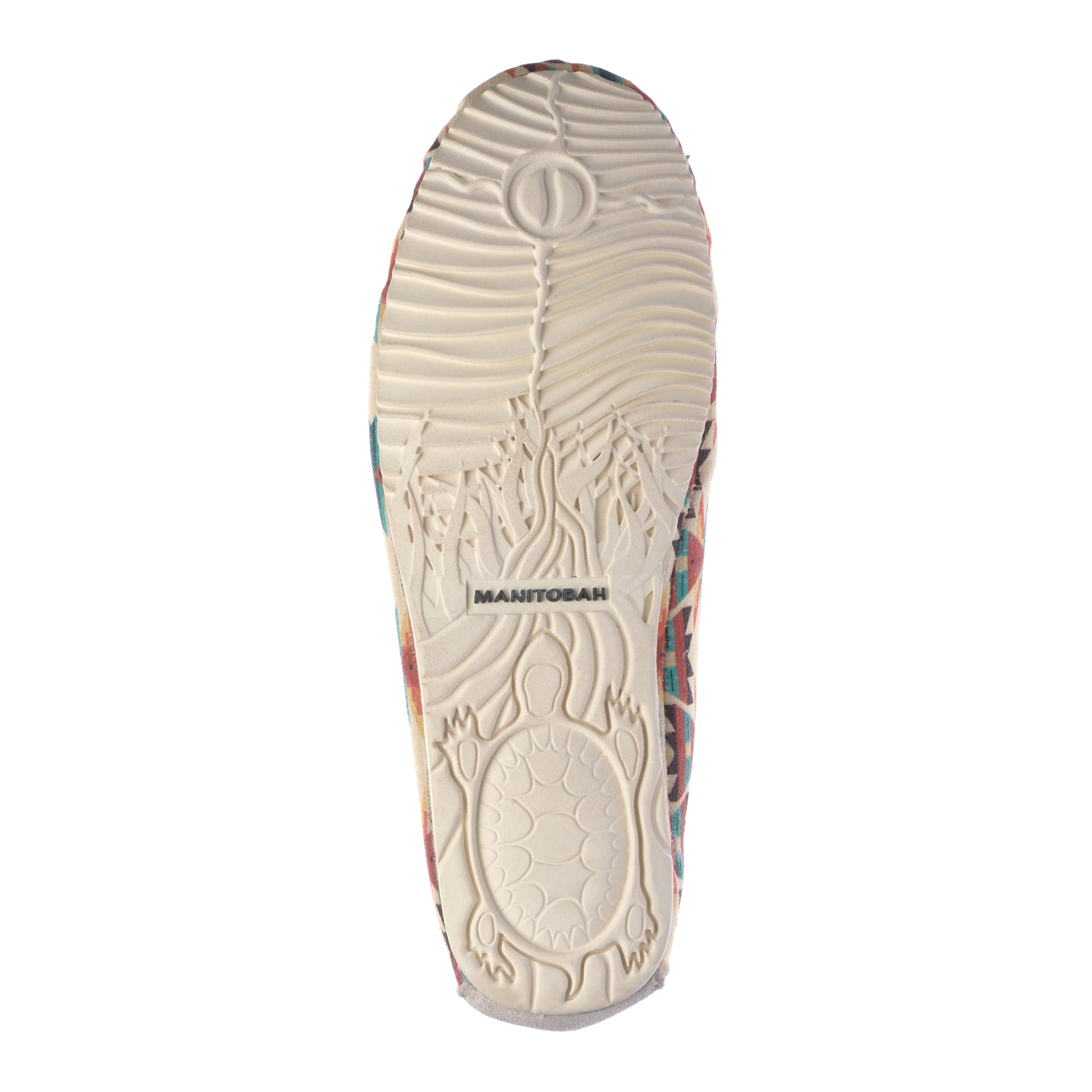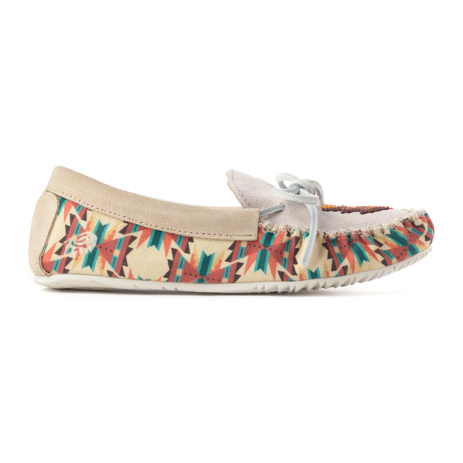 Introducing the Kayak Canyon, a contemporary interpretation of the timeless Kayak silhouette. Crafted with a waxed canvas upper adorned with beadwork by Nimiipuu artist Mikailah Thompson and featuring a sole designed by Cree artist Heather Endall, this moccasin epitomizes essential summer style. Versatile enough for city strolls or forest trails, it seamlessly blends traditional heritage with modern flair.