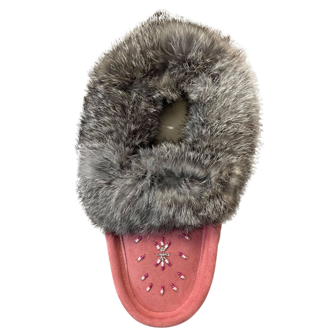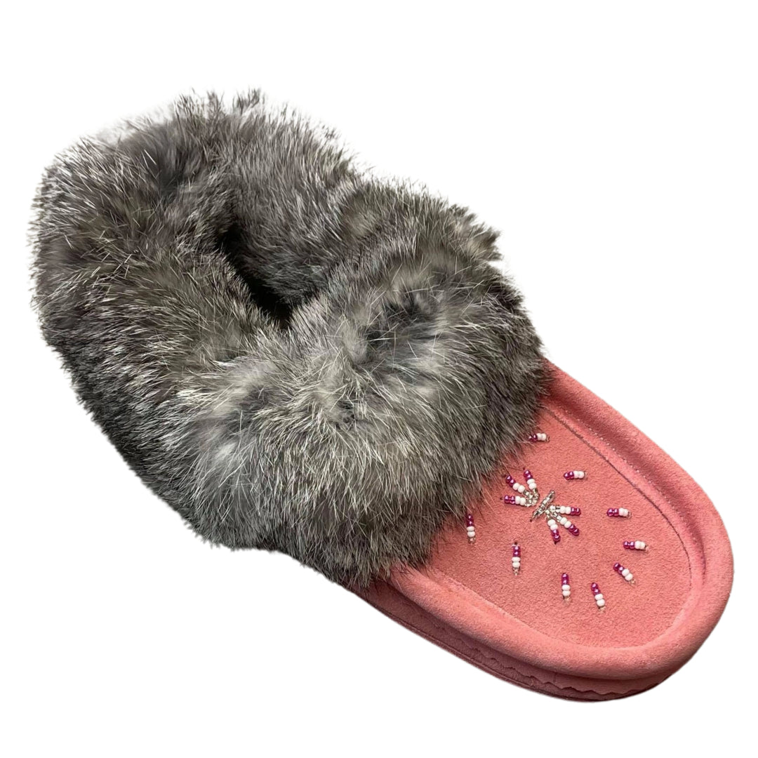 Crafted with genuine Canadian suede and fine rabbit fur, these moccasins bring together traditional craftsmanship and luxurious comfort. Each pair features a hand-sewn glass bead design, making every set unique.