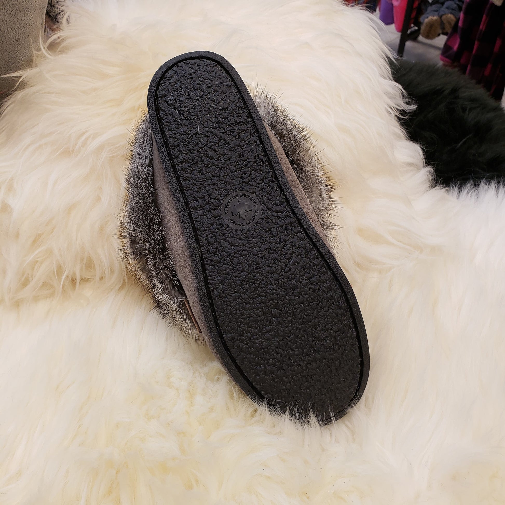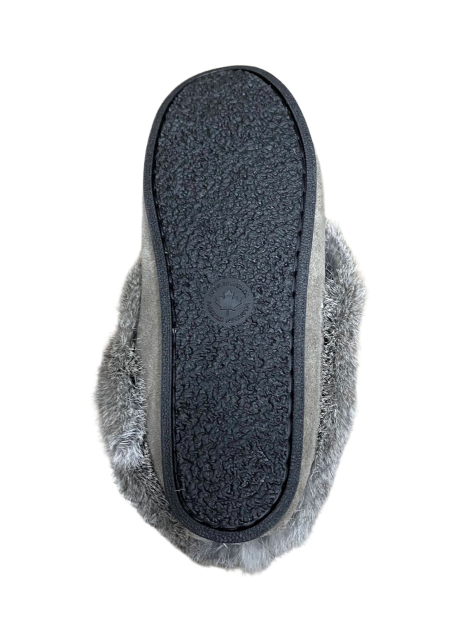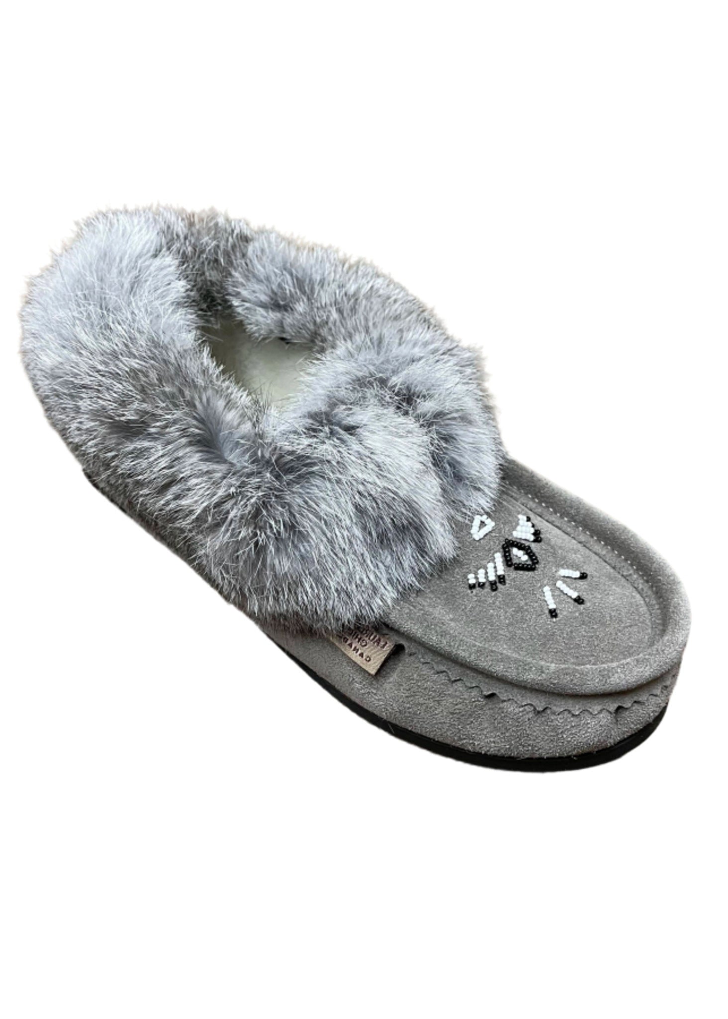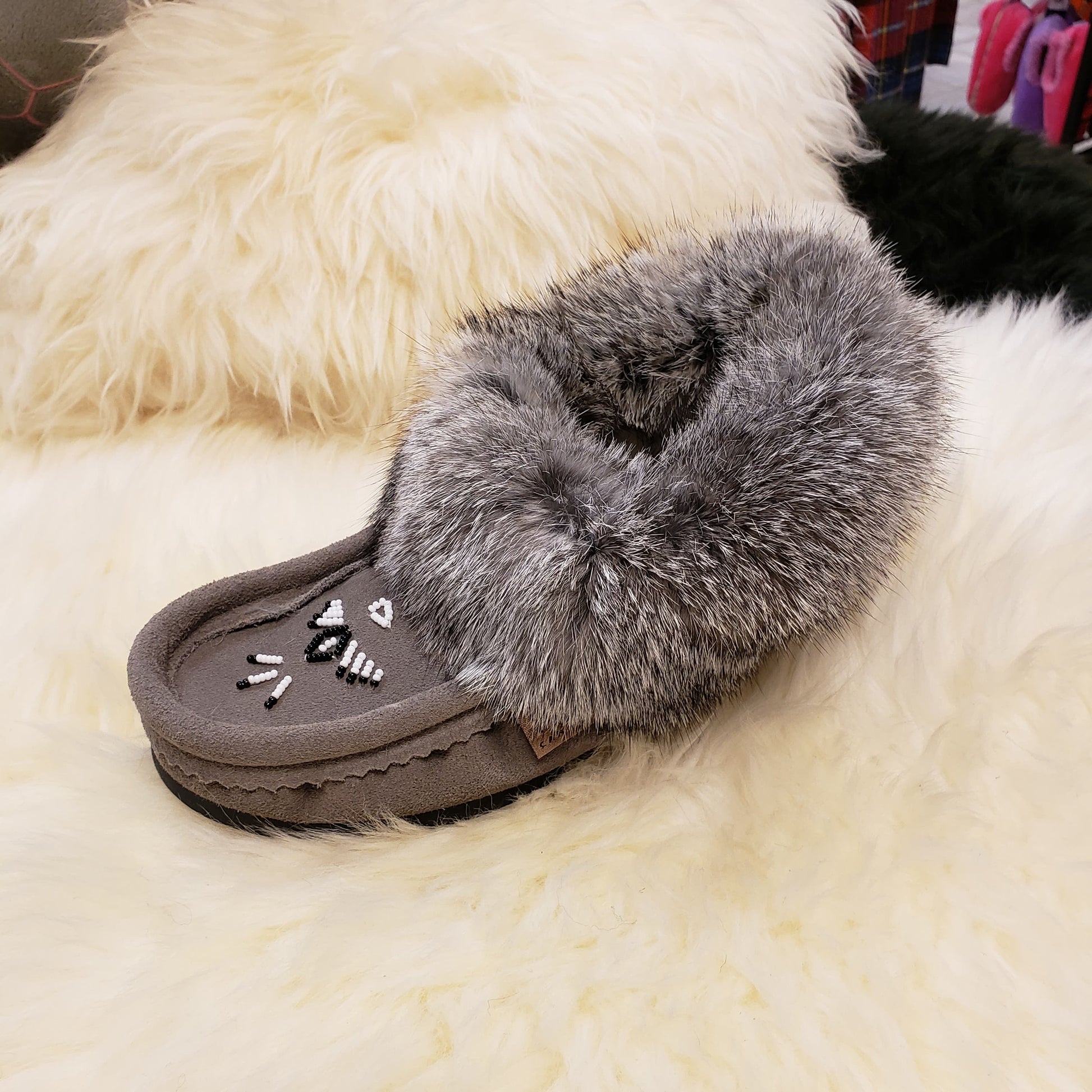 The interior of these women's moccasin slippers is lined with genuine sheepskin, offering a plush, warm, and exceptionally comfortable experience against your skin. On the exterior, you'll find cowhide suede complemented by a rabbit fur trim. These ladies' handmade moccasin slippers boast a rabbit fur cuff and an adorable hand-beaded design on the vamp, adding a touch of style to your comfort.
