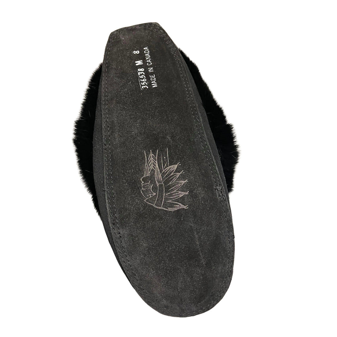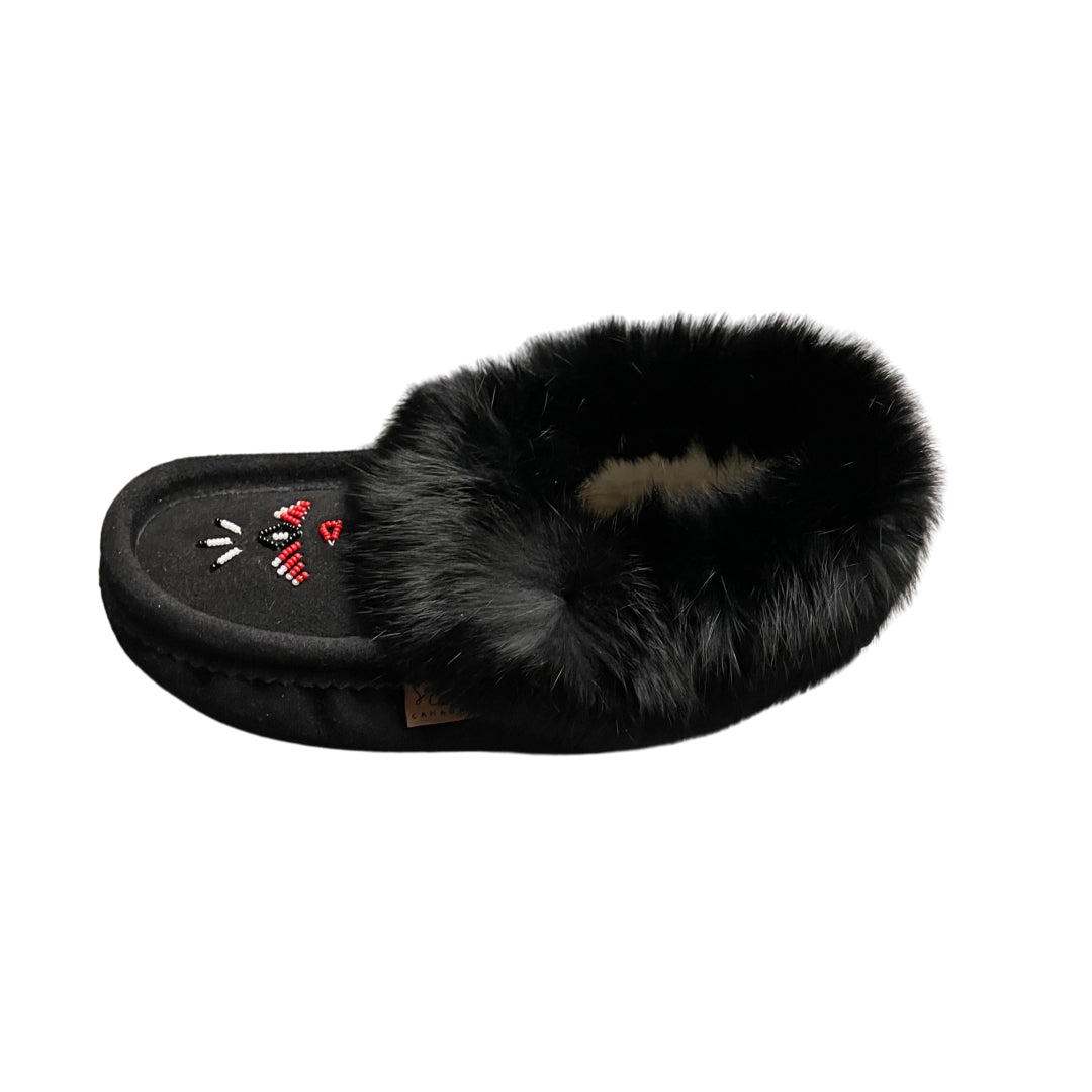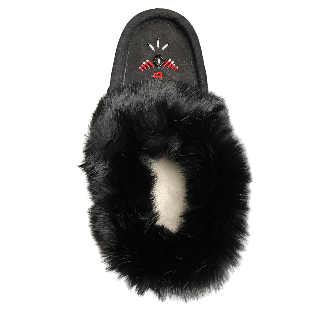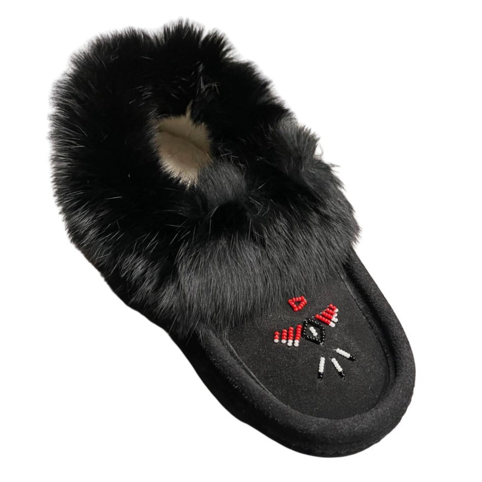 These men’s moccasins are crafted with genuine Canadian suede, a warm sheepskin lining, and trimmed with plush grey rabbit fur for a touch of luxury. Each pair features a hand-sewn glass bead design, making every moccasin truly one of a kind.