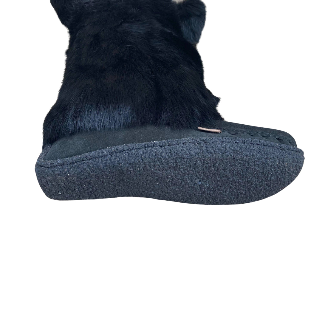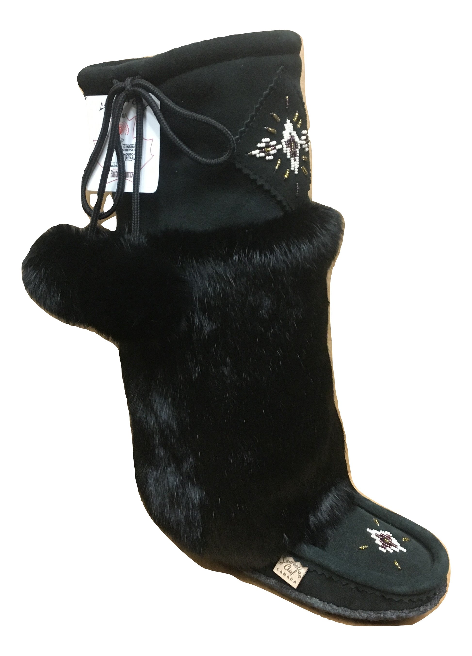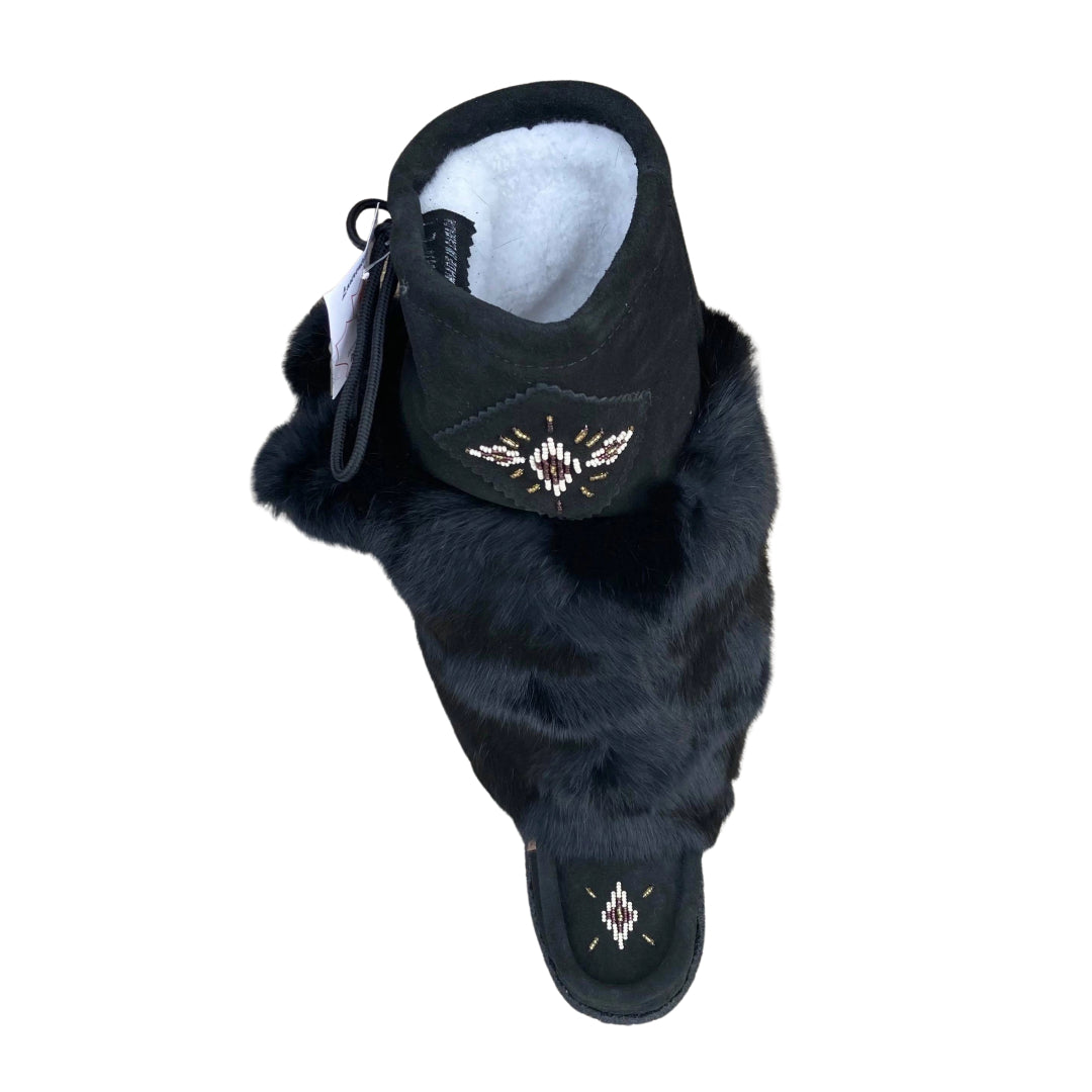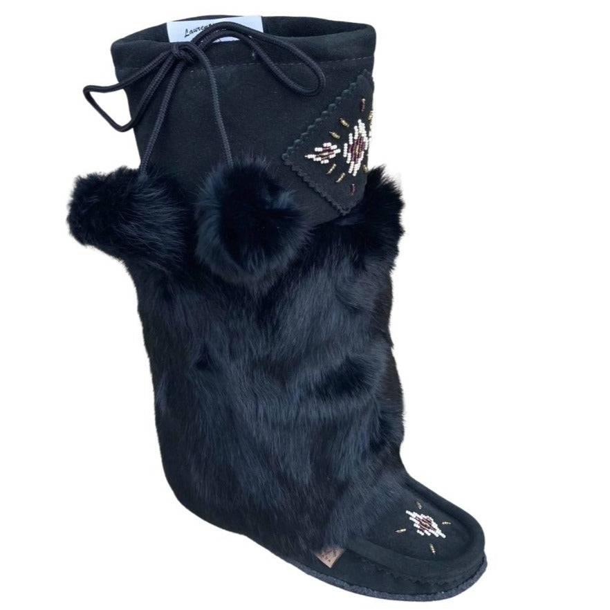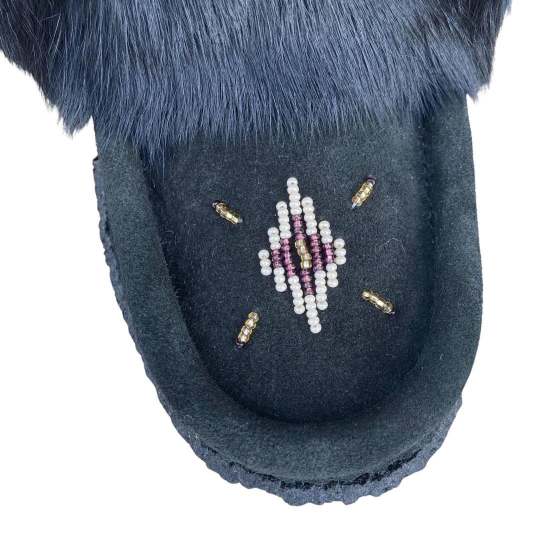 These women's mukluks are the best combination of fashion and comfort. They have a warm and cozy Sheepskin lining keeping your feet toasty while you are outdoors. The exterior of the boot has fuzzy rabbit fur. These women's traditional style mukluks are handmade from genuine suede. They have a matching hand-beaded design on the vamp giving them a unique look. They have a durable outdoor crepe/rubber sole. These women's traditional style mukluks are the best 'everyday' winter boots.