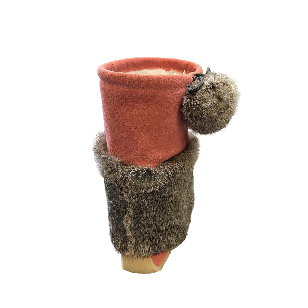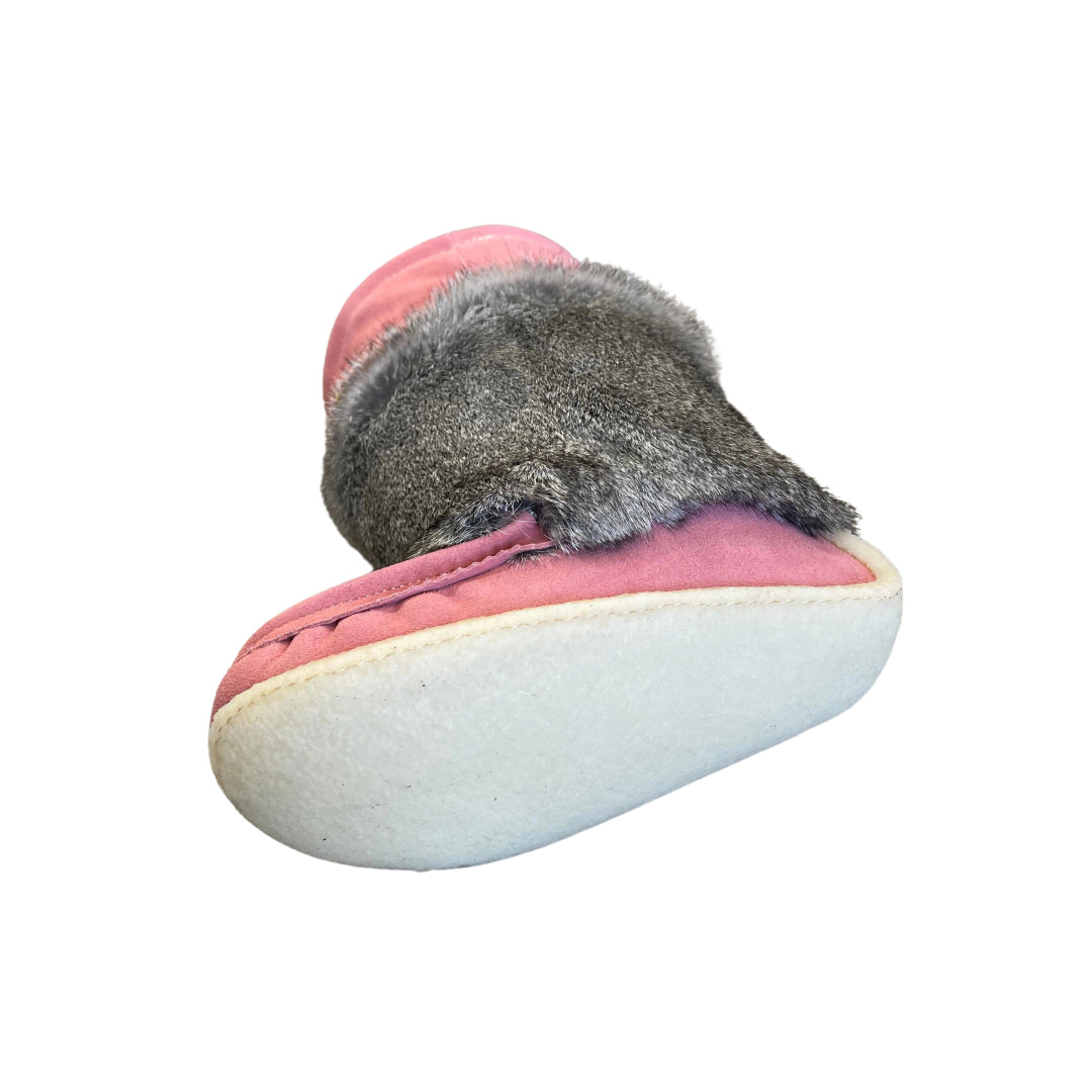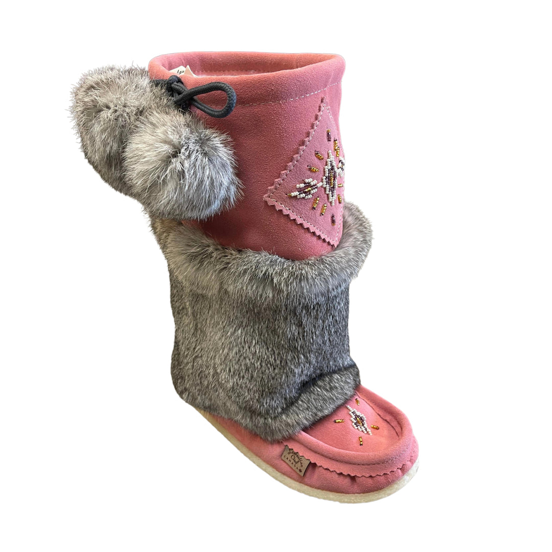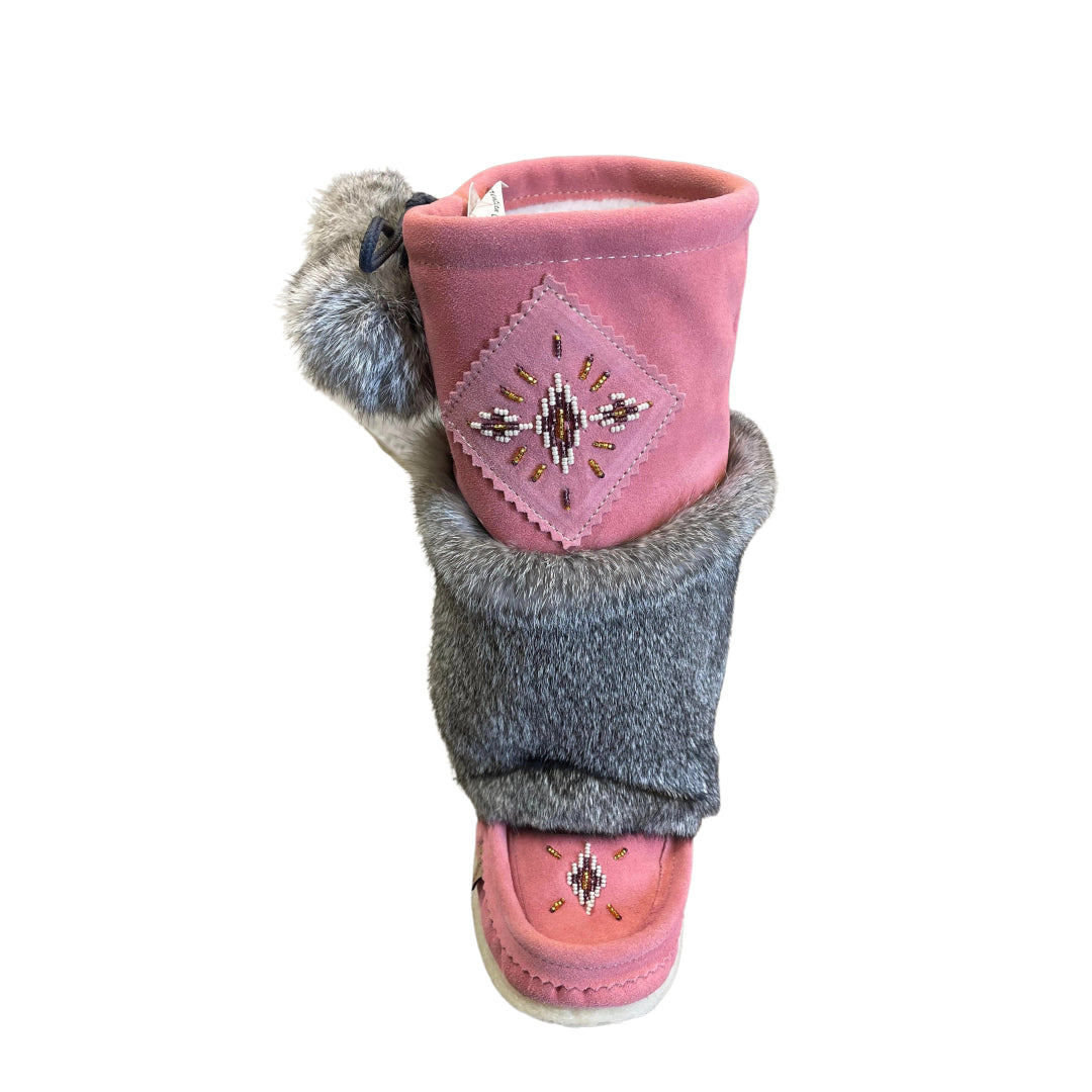 These women's Mid height mukluks are the best combination of fashion and comfort. They have a warm and cozy Sheepskin lining keeping your feet toasty while you are outdoors. The exterior of the boot has fuzzy rabbit fur. These women's traditional style mukluks are handmade from genuine suede. They have a matching hand-beaded design on the vamp giving them a unique look. They have a durable outdoor crepe/rubber sole. These women's traditional style mukluks are the best 'everyday' winter boot.