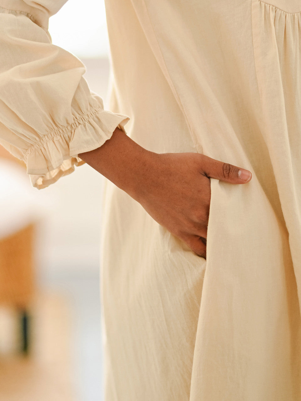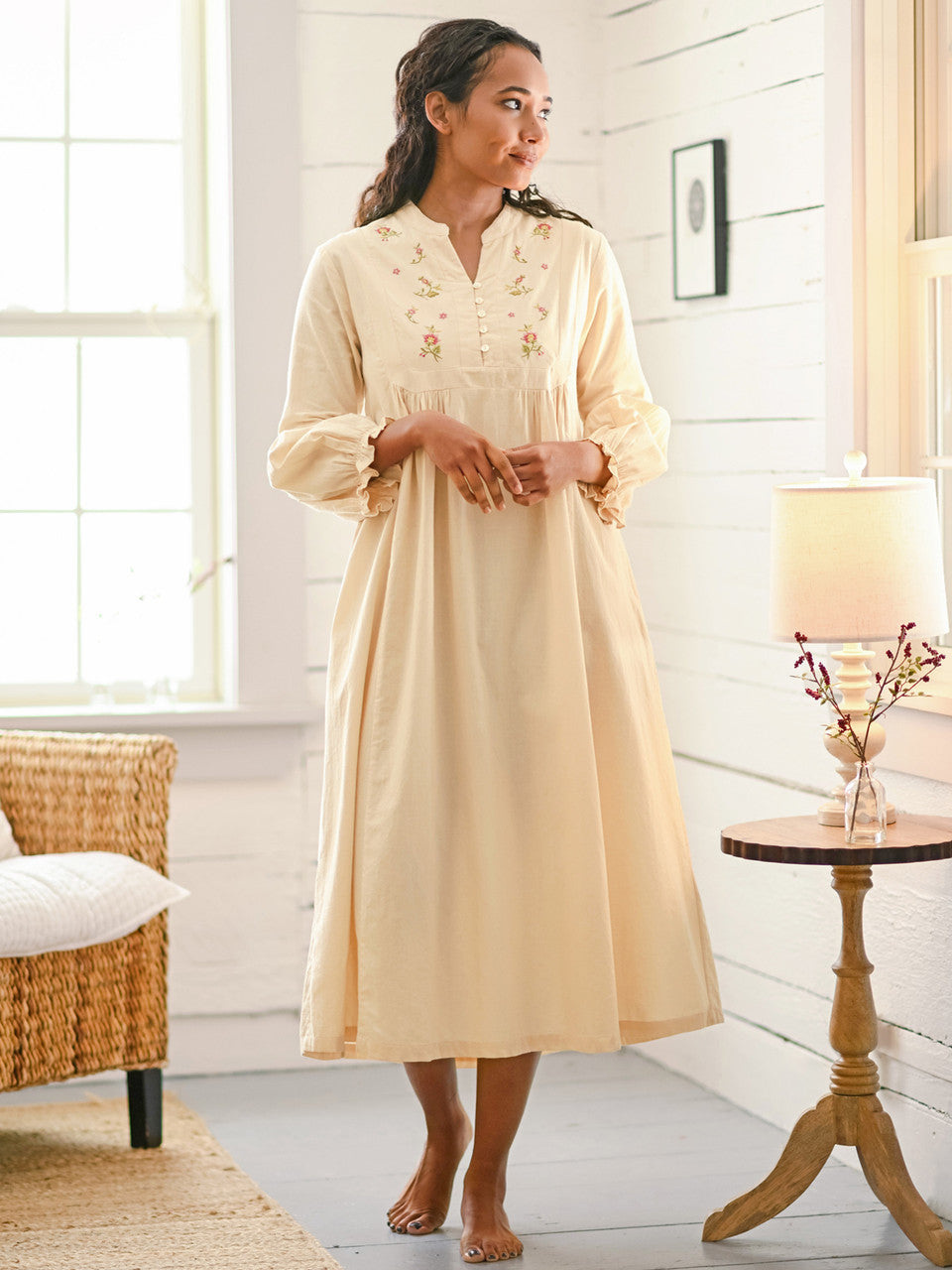 The Promise Nighty is a perfect blend of comfort and timeless elegance. Made from April Cornell’s signature soft cotton, this nighty features delicate hand-guided embroidery, mother-of-pearl buttons, gentle gathers, and practical side seam pockets for everyday ease.