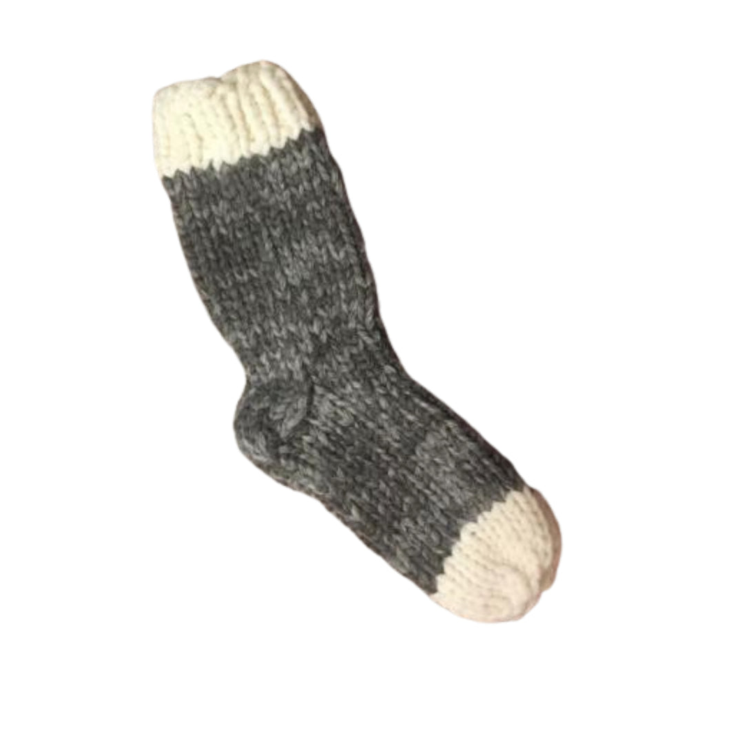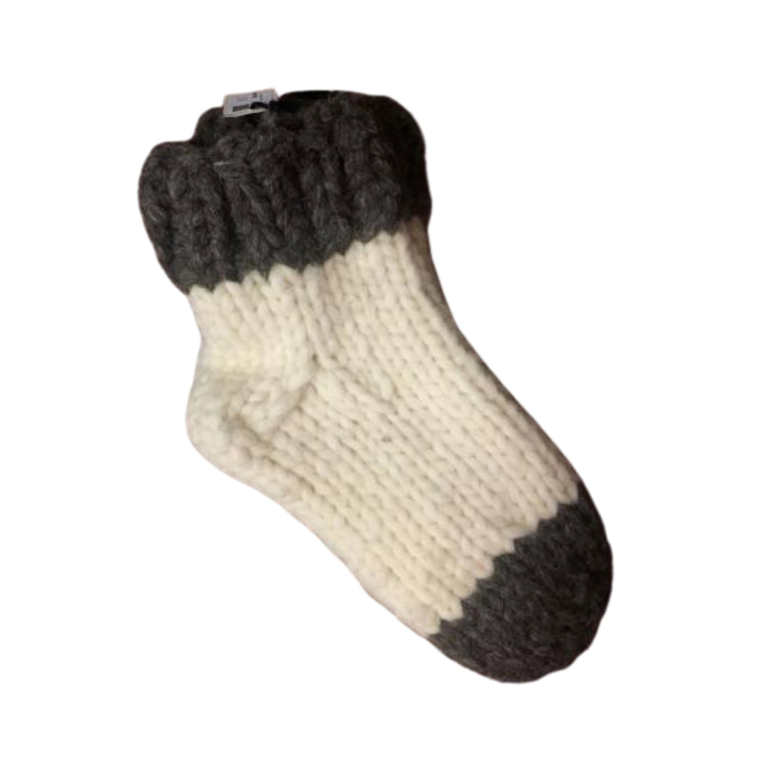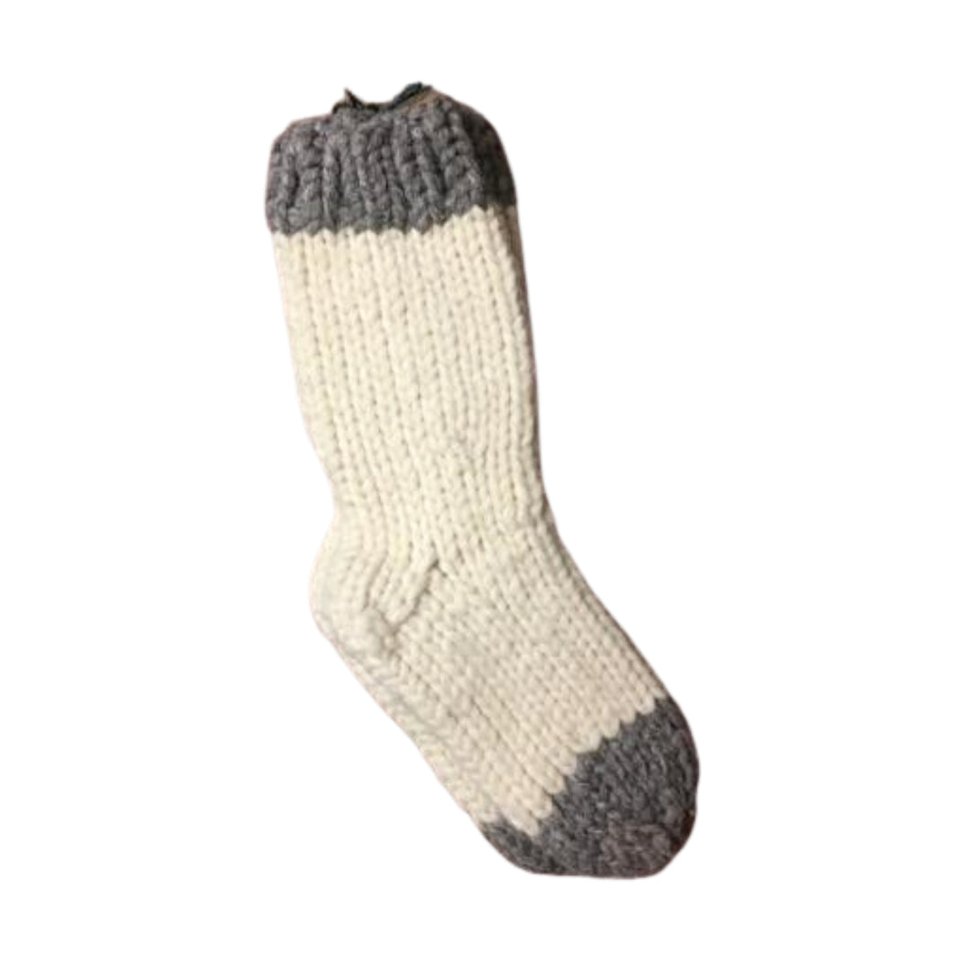 These socks are lovingly hand knit by a lady who lives in a small town in Saskatchewan. This specific type of sock is one of a kind. Made from 100% Raw wool. Can be worn as a slipper or used as a boot liner.