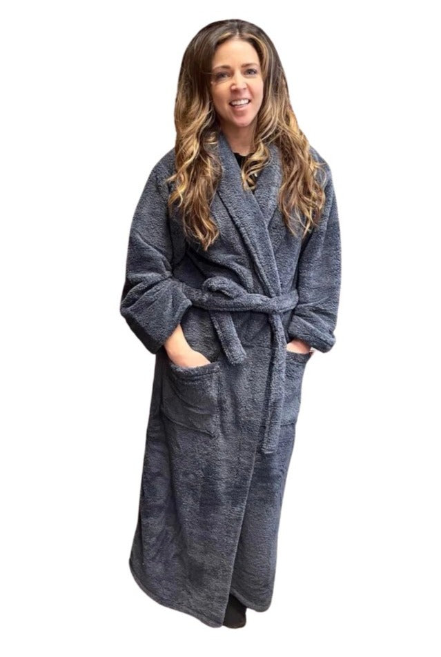 This full-length plush robe falls to ankle length providing you with full coverage and ultimate warmth. The long outer sash generously secures the robe wrap around you. A fluffy shawl collar caresses your neck with furry mink-like softness and the absorbent micro terry fabric keeps you dry. Cozy patch pockets on the front are the best size and depth to keep your hands warm too.
