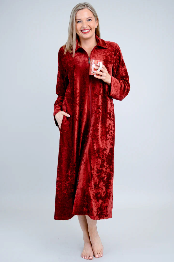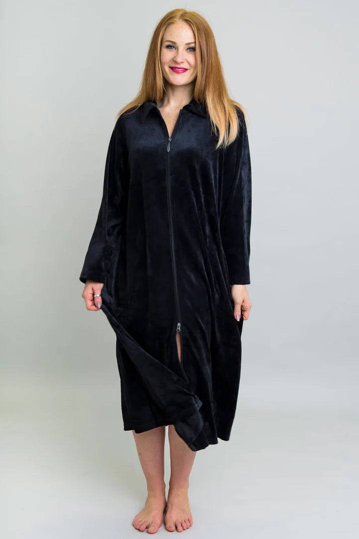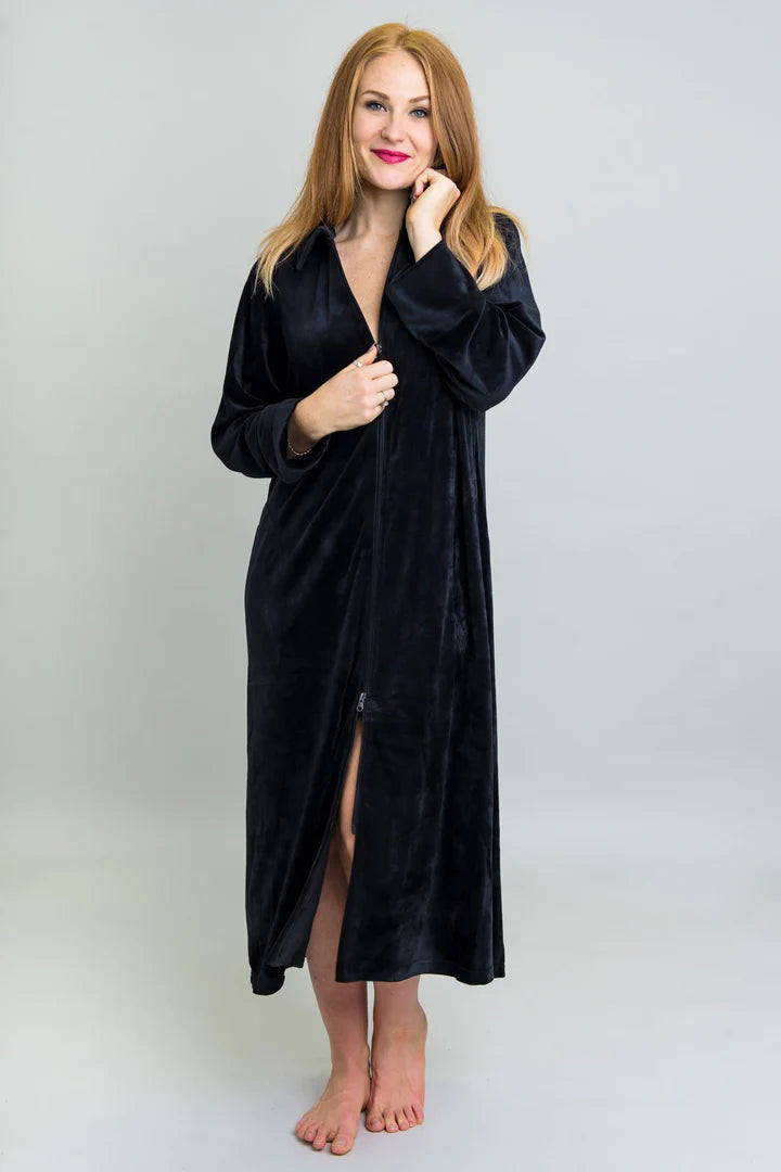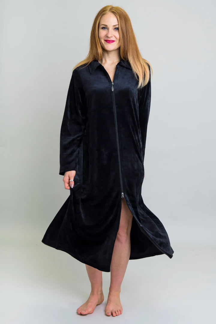 This Zippered Robe-Bamboo is the perfect combination of comfort and security, with a small collar, long zipper closure, and inset pockets. Lounging, showering, or grabbing the mail - now you can do it all without worrying about your robe coming untied. Blue Sky fit (true to size) and an ultra-luxe bamboo-cotton-Lycra blend make this robe a must-have!